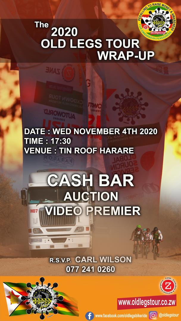In Harare please be invited to the Tin Roof on Wednesday the 4th of November for the final wrap of the Zimbabwe edition of the Lockdown Tour, plus the world premiere of the Lockdown Movie. You’ll be able to meet the Old Legs Team, ask them questions, but not about when the toilet tent blew away in the Sengwa River. It is a fund raiser and Mark Pozzo will be off auctioning Lockdown Tour memorabilia including a Ride Jersey, plus some fabulous free weekends away, plus an incredible Gift Hamper that unfortunately, I’ve already won.